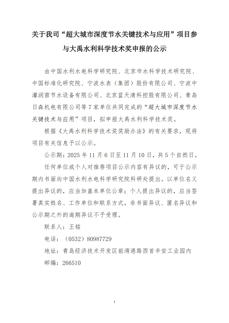 关于我院“超大城市深度节水关键技术与应用”项目参与大禹水利科学技术奖申报的公示